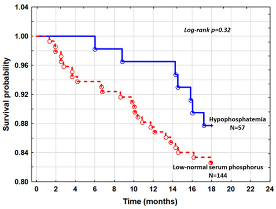 The cumulative survival curves comparing patients with hypophosphatemia and low normal serum phosphorus.