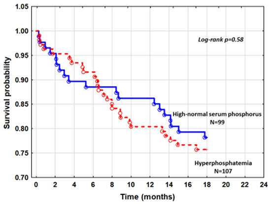 Mortality in patients with hyperphosphatemia and patients with high-normal phosphorus from quintile 5 was also comparable (log-rank p = 0.58) (Figure 3).
