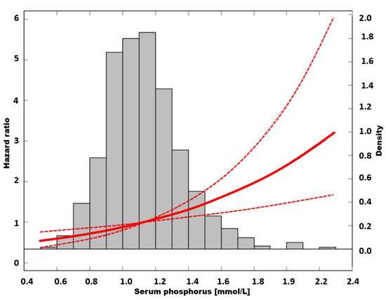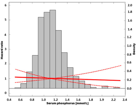 Our final analysis was designed to identify the risk attributable to sP taken as a continuous variable together with all potential confounders, such as age, sex, BMI, weight loss, hsCRP, eGFRMDRD, serum calcium, LVEF, serum sodium, NTproBNP, the use of beta-blockers and digoxin, loop diuretic dose, and the percentage of the recommended dose of ACEI/ARB and aldosterone antagonist administered to patients. In this final model, the only significant independent predictors of mortality were NYHA class (HR = 1.92; 95%CI: 1.42–2.59, p < 0.001), NTproBNP (1.08; 95%CI: 1.04–1.13, per 1000 pg/mL increase, p < 0.001), serum calcium (HR = 1.24; 95%CI: 1.02–1.51 per 0.2 mmol/L increase, p = 0.02), and loop diuretic dose (HR = 1.12; 95%CI: 1.02–1.24, per 40 mg of furosemide equivalent increase, p = 0.02). Serum phosphorus was not a significant predictor. The relationship between sP and mortality after full adjustment is shown on Figure 6.