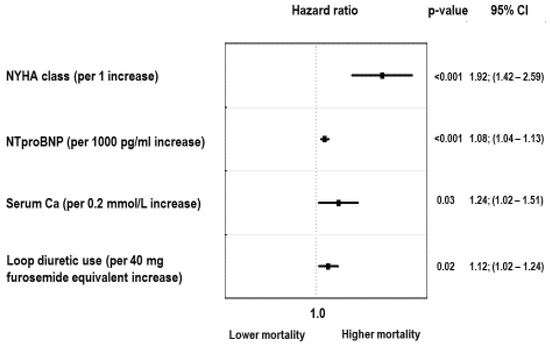 In one investigation that included a population similar to ours, the association of sP with the composite of death and heart transplantation was independent of NYHA class and natriuretic peptides [14]. This discrepancy may be explained by differences in clinical outcome because in this study, up to 24% of the composite end point was driven by heart transplantation alone [14]. Another reason for the inconsistent result may come from the stratification by gender used in the study mentioned above but not in ours.