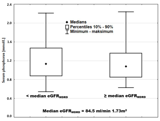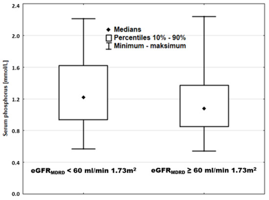 Our data challenged this interpretation. Among patients with reduced eGFRMDRD (<60 mL/min × 1.73 m2) and with preserved eGFRMDRD (≥60 mL/min × 1.73 m2), there was a huge overlap of sP. Hypophosphatemia was present in patients with low kidney function, while hyperphosphatemia was seen in normal eGFRMDRD (Figure 7).