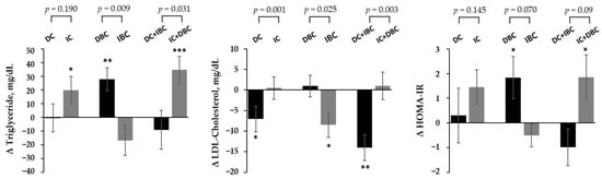 Changes in metabolic parameters by target metabolites group after lifestyle intervention. p-values were calculated using ANCOVA after adjustment for age, sex, baseline BMI z-score, values for the respective outcome traits at baseline to compare differences of between-groups at 6 months. Paired t-test was used to compare difference between pre-intervention (0 M) and post-intervention (6 months) within each group, and p-values less than 0.05 are marked with asterisks (* p < 0.05, ** p < 0.01, *** p < 0.001). DC, decreased choline group; IC, increased choline group; DBC, decreased betaine/choline group IBC, increased betaine/choline group.