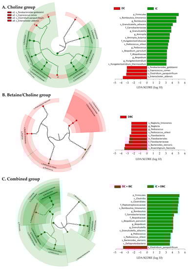 Intestinal microbiota taxa that discriminate between change groups (decrease vs. increase) in choline and B/C ratio after 6 months. Linear discriminant analysis with effect size (LEfSe) was performed using relative abundance data. Data shown are the log 10 linear discriminant analysis (LDA) scores following LEfSe analysis and the hierarchy of discriminating taxa visualized as cladograms for class comparisons between change groups of (A) choline, (B) betaine/choline, and (C) both choline and betaine/choline. DC, decreased choline group; IC, increased choline group; DBC, decreased betaine/choline group IBC, increased betaine/choline group.