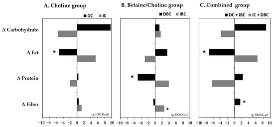 The association between dietary intake changes and target metabolites groups of (A) Choline, (B) Betaine/Choline, and (C) both choline and betaine/choline over a period of baseline to 6 months (Δ). In the paired t-test between pre-intervention (baseline) and post-intervention (6 months) values within each group, p-values less than 0.05 are marked with asterisks (*). DC, decreased choline group; IC, increased choline group; DBC, decreased betaine/choline group IBC, increased betaine/choline group.