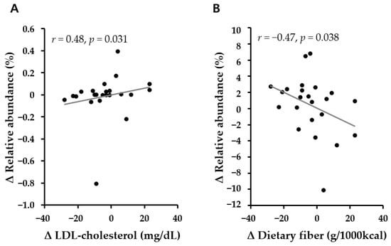 The correlation between changes in Romboutsia and (A) LDL-cholesterol and (B) dietary fiber over a period of baseline to 6 months (Δ). Spearman’s partial correlation analyses adjusted for age, sex, and baseline BMI z-score were performed.