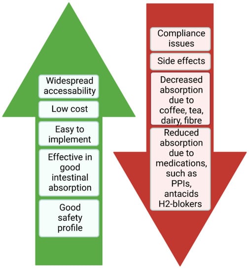 According to the ECCO guidelines, oral iron supplementation should be prescribed to IBD patients with normal CRP values and in clinical/endoscopic remission with mild IDA (hemoglobin >10 g/dL) [9,13,57]. Currently, two forms of oral iron preparations are available: a divalent Fe2+ and ferric form with sugar complexes Fe3+ [22,57,59]. Table 5 shows the most common iron formulations.