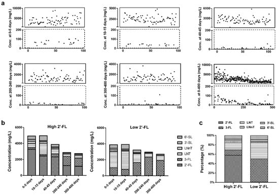 2′-FL was detected in 484 (99.2%) out of 488 breast milk samples. Based on the 2′-FL level of 200 mg/L, breast milk samples were divided into the high 2′-FL group, which accounted for 79% of the total population, and low 2′-FL level groups, which accounted for 21% of the total number of samples (Figure 1a). The median level of 2′-FL was 2001 mg/L in the high 2′-FL group and 20 mg/L in the low 2′-FL group from 0 to 400 days.
