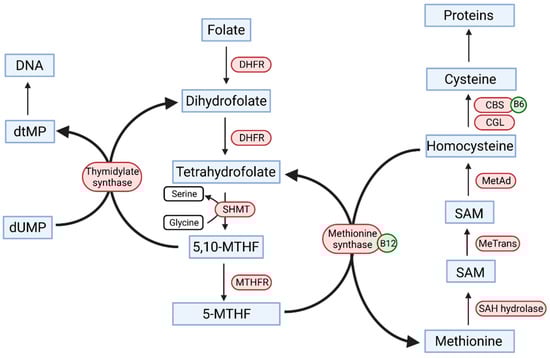 The molecular structure of folic acid comprises three different moieties—glutamic acid residue, pteroyl group, and para-aminobenzoic acid [11]. However, it must be subjected to a two-step enzymatic reaction with the dihydrofolic acid intermediate and the dihydrofolate reductase (DHFR) enzyme before it becomes an active coenzyme, i.e., the THF (tetrahydrofolian) form [5]. Subsequently, THF converts to 5-10-MTHF (methylenetetrahydrofolate), and it is reduced by MTHFR to 5-MTHF, which is involved in homocysteine conversion to methionine, donating the remaining methyl group in the process via methionine synthase. Figure 1 shows a diagram of folic acid metabolic pathways. Apart from the abovementioned elements, vitamin B12 and B6 also play a major role in the metabolism of homocysteine [12]. In fact, folic acid takes part in one-carbon metabolism, because 1-carbon units are transferred to THF for reduction or oxidation and are essential for DNA synthesis. S-adenosylmethionine is a methyl donor for biological methylation, including DNA and protein methylation. Low concentrations of folic acid in cell division inhibit the conversion of dUMP (deoxyuridine monophosphate) to dTMP (thymidylate) and uracil may be substituted in the DNA sequence [13]. Therefore, folic acid deficiency may lead to genomic hypomethylation [14]. It has been proven that cytosine methylation in the DNA sequence plays an important role in gene expression [15]. The control of gene transcription and particularly its suppression can stem from changes in methylation levels within the promoter regions of genes. Hypomethylation caused by folic acid deficiency can lead to the induction of protooncogenes, which promote tumorigenesis [16]. Hypermethylation, in turn, causes inactivation of the promoter regions of suppressor genes.