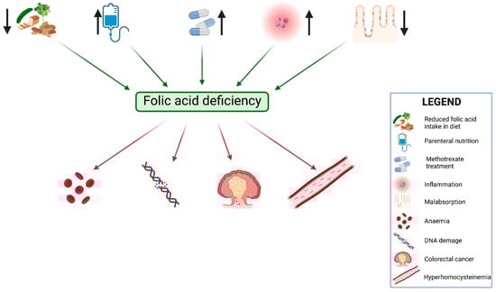 Folic acid plays an important role in IBD patients—it affects the growth and regulation of cell functions because it is involved in the production of nucleic acids, protein synthesis, and amino acid transformation. IBD treatment involves the administration of methotrexate, a chemical compound included in the antimetabolite group, which has immunomodulatory and anti-inflammatory activity. The structure of methotrexate is similar to that of folic acid, and it inhibits the activity of dihydrofolate reductase, which catalyzes the transformation of dihydrofolate to tetrahydrofolate [28]. The most common adverse reactions comprise nausea, vomiting, diarrhea, bloating, liver damage, bone marrow suppression, pneumonitis, teratogenic effects, and folic acid deficiency. Studies have shown that the supplementation of folic acid may decrease the occurrence of side effects, mainly gastrointestinal disease, inflammation of the mucosa, and myelotoxicity [29]. The causes and consequences of folic acid deficiency in IBD are presented on Figure 2.