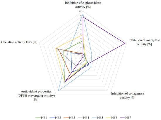 Finally, to better visualize and compare the obtained results, we performed the data as a star diagram (Figure 1). According to the presented relationship, HB7 and HB5 have the highest antidiabetic potential. Both of them were characterized by high hypoglycemic properties, especially by inhibiting α-glucosidase, and also, but in a moderate way, α-amylase. HB5 is also characterized by preventive potential against diabetic complications, due to its highest antioxidant capacity and the best collagenase inhibition properties. Another HBs, whose biological properties (at least 2 out of 3 examined) suggest an interesting preventive potential, are HB6, HB1, and HB4, respectively, for which the chelating and antioxidant potential were noticeable.