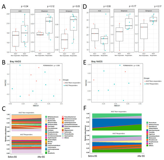 Alpha-diversity indexes, beta-diversity and longitudinal modulation of microbiota and mycobiota according to the evolution of verbal memory, at six months after bariatric surgery. Fecal samples were collected the day before surgery and six months after bariatric surgery (BS). (A,B) show respectively the alpha-diversity indexes and beta-diversity in post-BS, according to an improvement or not of AVLT score at six months post-BS. Beta diversity, which assesses differences in microbiota composition between samples according to lung function at baseline, using a Non-metric Multidimensional Scaling (NMDS) ordination method with Bray–Curtis distance metric. (C) shows the longitudinal evolution of bacterial microbiota using GAMLSS-BEZI models, according to an improvement or not of AVLT score at six months post-BS. (D–F) illustrate the same parameters for the mycobiota.
