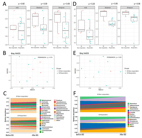 Alpha-diversity indexes, beta-diversity and longitudinal modulation of microbiota and mycobiota according to the evolution of working memory, at six months after bariatric surgery. (A,B) show respectively the alpha-diversity indexes and beta-diversity in post-BS, according to an improvement or not of SS score at six months post-BS. Beta diversity which assesses differences in microbiota composition between samples according to lung function at baseline, using a Non-metric Multidimensional Scaling (NMDS) ordination method with Bray–Curtis distance metric. (C) shows the longitudinal evolution of bacterial microbiota, according to an improvement or not of SS score at six months post-BS. (D–F) illustrate the same parameters for the mycobiota.