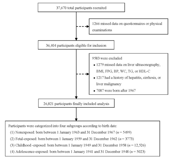 The Chinese Great Famine mainly lasted from 1959 to 1962. We categorized participants into four famine exposure subgroups according to the date of birth: nonexposed (born between 1 January 1963 to 31 December 1967), fetal-exposed (born between 1 January 1959 to 31 December 1962), childhood-exposed (born between 1 January 1949 to 31 December 1958), and adolescence-exposed (born between 1 January 1941 to 31 December 1948), as described in previous studies [13,14].