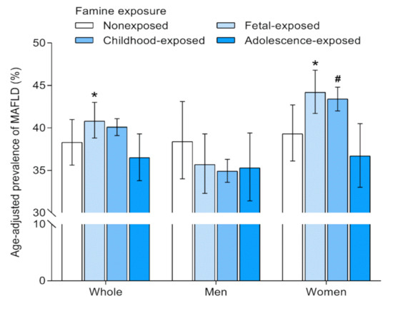 Age-adjusted prevalence of MAFLD according to famine exposure in early life. Prevalence rate was derived from logistic regression models. Error bars indicate 95% confidence intervals. MAFLD, metabolic associated fatty liver disease. * Compared with the unexposed, p-value < 0.05. # Compared with the unexposed, 0.05 < p-value < 0.1.