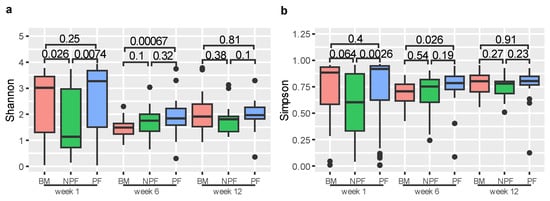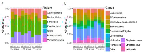 We used Shannon and Simpson indices to measure the alpha diversity of gut microbiota (Figure 1). At week 1, the Shannon index of the NPF group was significantly lower than those in the BM and PF groups (p = 0.026 and p = 0.0074, respectively). Similarly, the Simpson index of the NPF group was significantly lower than those in the PF group (p = 0.0026). At week 6, the Shannon and Simpson indices of the BM group were significantly lower than the PF group (p = 0.00067 and p = 0.0026, respectively). Among the three stages, no other significant difference was observed between the groups (all p > 0.05).