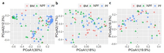 The PCoA was then conducted to examine the spatial array of bacterial taxa in each group. The results of plotting the infant microbiota at week 1 (Figure 2a) demonstrated that the microbiota of the NPF and PF groups tended to cluster at the left and right sides of the graph, and a significant difference was observed in their beta diversity (F model = 3.494, R2 = 0.059, adonis p < 0.001). At week 6, differences in the bacterial taxa among the three groups were observed (F model = 2.140, R2 = 0.060, adonis p = 0.008), and the clustering was not obvious in the PCoA plot (Figure 2b). In addition, a significant difference in beta diversity was observed between each of the two groups (all adonis p < 0.05). Finally, as shown in Figure 2c, among all the three groups, no significant differences were observed at week 12 (F model = 1.155, R2 = 0.046, adonis p = 0.275).