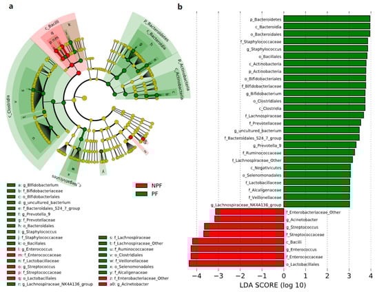 Differential bacterial taxa between the NPF and PF groups at week 1 revealed by LDA cladogram (a) and ranking (b). Only taxa with an LDA score threshold more than 3 are shown. LEfSe, linear discriminant analysis of effect size; LDA, linear discriminant analysis; PF, probiotics formula; NPF, non-probiotics formula; p, phylum; c, class; f, family; o, order; g, genus.