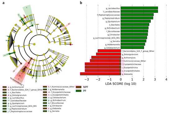 Differential bacterial taxa between the NPF and PF groups at week 6 revealed by LDA cladogram (a) and ranking (b). Only taxa with an LDA score threshold larger than 2 are shown. LEfSe, linear discriminant analysis of effect size; LDA, linear discriminant analysis; PF, probiotics formula; NPF, non-probiotics formula; p, phylum; c, class; f, family; o, order; g, genus.