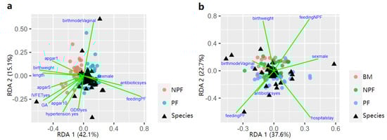 Influencing factors of the infant gut microbiota composition between NFP and PF group showed by RDA triplot at week 1 (a), and all the three groups at week 6 (b). RDA, redundancy analysis; BM, breastmilk; PF, probiotics formula; NPF, non−probiotics formula.