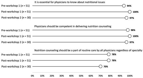 The survey was distributed through Qualtrics (https://www.qualtrics.com/ accessed on 15 January 2021) to all MS1s before the nutrition workshop (pre-workshop 1), after the nutrition workshop (post-workshop 1), and after a second nutrition workshop that took place five months later (post-workshop 2). Each survey was comprised of six elements designed to assess the students’ perceptions of the value of physician nutrition knowledge and counseling skills as well as their own comfort with nutritional knowledge, assessment, and counseling. Reponses were based on a 5-point Likert scale: 1 = strongly disagree, 2 = disagree, 3 = neither agree nor disagree, 4 = agree, and 5 = strongly agree.