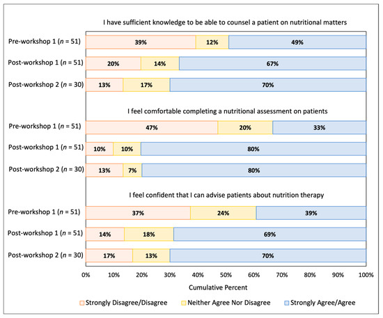 Figure 2 shows the cumulative percentage of student responses regarding the students’ self-perceived knowledge, comfort, and confidence before and after the nutritional workshop. We found a significant improvement in all three items after the workshop. Sixty-seven percent of students (N = 34) strongly agree/agreed that they had sufficient knowledge to provide nutrition counseling to a patient after the workshop compared to 49% pre-workshop (N = 25; Z = −2.3, p = 0.02). Eighty percent of students (N = 41) strongly agree/agreed that they were comfortable in administering a nutritional assessment after the workshop compared to 33% who were comfortable pre-workshop (N = 17; Z = −4.6, p < 0.001). Finally, 69% (N = 35) of the students strongly agree/agreed that they felt confident that they could advise patients about nutrition after the workshop compared to 39% pre-workshop (N = 20; Z = −3.5, p < 0.001).