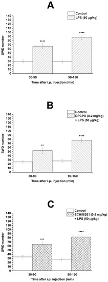 It has been previously demonstrated [23,34] that i.p. LPS (50 µg/kg) alone significantly enhanced the SWD number (group 1; Figure 2A; Table 1) between 30 and 150 min compared to the control. Combined administration of DPCPX (0.2 mg/kg) with LPS (50 µg/kg) (group 2) and SCH58261 (0.5 mg/kg) with LPS (50 µg/kg) (group 3) did not change the LPS-generated increase in SWD number (Figure 2B,C; Table 1).