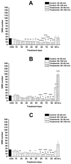 As it was demonstrated previously, KEKS-supplemented food abolished the influence of i.p. LPS (50 µg/kg) alone on SWD number [23,34] (Figure 2A) between 30 and 150 min on the ninth KEKS day [19] (group 4; Figure 3A; Table 2), compared to control levels. Nevertheless, on the ninth day of KEKS food administration, when this treatment was combined with i.p. DPCPX (0.2 mg/kg) and LPS (50 µg/kg) (group 5; Figure 3B; Table 2), the SWD number significantly increased, compared to the control. Thus, administration of DPCPX abolished the alleviating effect of KEKS food on the LPS-evoked increase in SWD number (Figure 3A,B). Combined administration of SCH58261 (0.5 mg/kg) and LPS (50 µg/kg) with KEKS food (on the ninth day of KEKS food administration) was not able to change the beneficial effect of KEKS food on the LPS-generated increase in SWD number between 30 and 90 min (group 6; Figure 3C; Table 2). Nevertheless, SCH58261 only decreased, but did not abolish the KEKS food-generated beneficial effect on the LPS-evoked increase in SWD number between 90 and 150 min on the ninth KEKS food administration day (group 6; Figure 3C; Table 2).