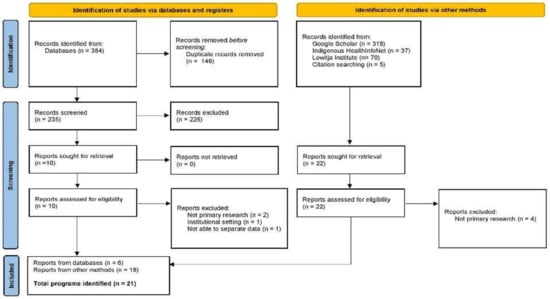 The academic database search yielded a total number of 384 records using the search strategy on five electronic databases (Medline = 124, Embase = 157, Scopus = 81, Informit Indigenous Collection = 21, Informit Family and Society Collection = 1). This was reduced to 235 after 149 duplicates were removed. A total of 235 records were then screened, with 225 records excluded. Ten reports were sought for full text retrieval and assessed for eligibility. Of these ten reports, a total of six reports representing five programs were identified through databases and included in this review.