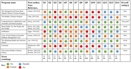 The 2018 SAHMRI CREATE Aboriginal and Torres Strait Islander Quality Appraisal Tool results of peer-reviewed programs presented as an adapted traffic light plot. Q1 Did the research respond to a need or priority determined by the community?; Q2 Was community consultation and engagement appropriately inclusive?; Q3 Did the research have Aboriginal and Torres Strait Islander research leadership?; Q4 Did the research have Aboriginal and Torres Strait Islander governance?; Q5 Were local community protocols respected and followed?; Q6 Did the researchers negotiate agreements in regards to rights of access to Aboriginal and Torres Strait Islander peoples existing intellectual and cultural property?; Q7 Did the researchers negotiate agreements to protect Aboriginal and Torres Strait Islander peoples’ ownership of intellectual and cultural property created through the research?; Q8 Did Aboriginal and Torres Strait Islander peoples and communities have control over the collection and management of research materials?; Q9 Was the research guided by an Indigenous research paradigm?; Q10 Does the research take a strengths-based approach, acknowledging and moving beyond practices that have harmed Aboriginal and Torres Strait peoples in the past?; Q11 Did the researchers plan to and translate the findings into sustainable changes in policy and/or practice?; Q12 Did the research benefit the participants and Aboriginal and Torres Strait Islander communities?; Q13 Did the research demonstrate capacity strengthening for Aboriginal and Torres Strait Islander individuals?; Q14 Did everyone involved in the research have opportunities to learn from each other? The symbol § represents the overall rating of peer-reviewed programs. A final rating of “very good” was assigned to papers that answered yes to over 75% of questions, “good” to those that answered yes to over 50% of questions, “fair” to those that answered yes to fewer than 50% of questions, and “poor” to those that answered yes to fewer than 25% of questions.