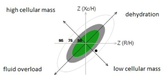 - Piccoli, A.; Rossi, B.; Pillon, L.; Bucciante, G. A new method for monitoring body fluid variation by bioimpedance analysis: The RXc graph. Kidney. Int. 1994, 46, 534e9. [Google Scholar] [CrossRef] [Green Version]