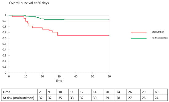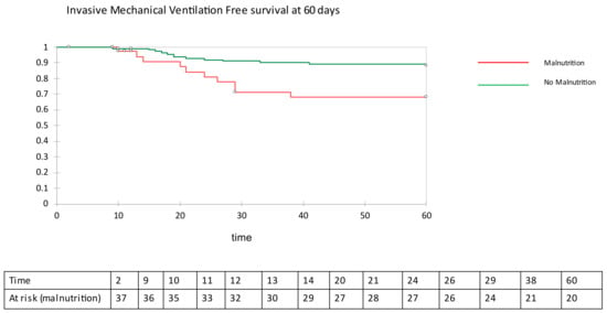 Table 3 reports the number of patients who required invasive mechanical ventilation and of those who died during the 60-day follow-up, together with duration of the hospital stay before discharge in those who survived COVID-19. Malnourished patients with COVID-19 pneumonia needed invasive mechanical ventilation more frequently than patients without evidence of malnutrition on BIVA. During follow-up, mortality in malnourished patients was 4- to 5-fold that of patients with normal nutritional status. Duration of hospitalization was longer by an average of 5 days in patients with malnutrition than in patients without malnutrition. In a survival analysis, invasive mechanical ventilation free survival (Figure 2) and overall survival (Figure 3) were significantly longer in COVID-19 patients with no evidence of malnutrition than in COVID-19 patients with evidence of malnutrition on BIVA (log-rank 7.887, p = 0.050 and log-rank 17.886, p < 0.001, respectively). With the use of the Cox proportional ratio (Table 4 and Table 5), malnutrition was associated with an increased risk of invasive mechanical ventilation (hazard ratio 4.375, p = 0.004) and death (hazard ratio 4.478, p = 0.004), even after adjustment for major confounders such as age, sex, and BMI.
