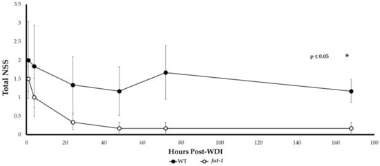 Use of the NSS has been previously validated and deemed a highly reliable prognostic tool. Performances on the NSS tasks have been found to be consistent with recovery, as determined by the functional and magnetic resonance imaging (MRI) measures [11,12]. Fat-1 mice had lower NSS at all time points post-WDI; the precise timing of when these differences became significant (p ≤ 0.05) was at the 24 h time point (Figure 2). Over time, fat-1 mice demonstrated progressive improvements in overall neurological and behavioral motor deficits post-WDI. An ~88% improvement in the NSS task success rate by fat-1 mice is observed comparing NSS at the 1 h vs. the 168 h time points (1.5 ± 0.3 and 0.2 ± 0.2, respectively). Although a similar trend was also observed in WT mice, there was only a 41.5% improvement in NSS comparing 1 h vs. 168 h (2.0 ± 1.0 and 1.2 ± 0.3, respectively). The average NSS remained elevated for the WT mice throughout the assessment period, relative to their fat-1 littermates. Sham fat-1 and WT mice had NSS scores of 0–0.5 in the first 24 h (data not shown).