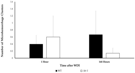 There were no statistical differences (p > 0.05) in the average number of microhemorrhage clusters when comparing WT to fat-1 mice in the 1 h and 168 h termination groups post-WDI (Figure 3 and Figure 4).
