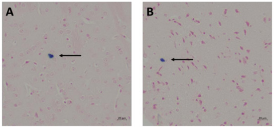 Images of sagittal brain sections of WT and fat-1 mice stained with Prussian blue 1 h post-WDI. Images were taken with a Zeiss AxioZoom V.16 at 11.2× magnification. Arrows indicate positive Prussian blue granules (i.e., microhemorrhage). (A) WT; (B) fat-1.