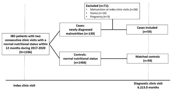 Of the 1596 patients who were treated at the IBD unit of the TLVMC between the years 2017 and 2020, 130 patients were defined as having malnutrition. Of these, 59 patients met the inclusion criteria as cases and had normal nutritional status during the index visit. Matched control patients (n = 59) were selected from the remaining 1466 patients who had normal nutritional status throughout the two consecutive clinic visits, and who were individually matched to cases. A flowchart of study population selection incorporating a timeline of physician consultation visits, from which data were collected, is depicted in Figure 1.