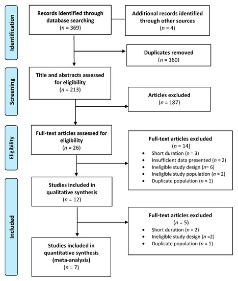 A total of 369 publications were identified in the database search and 160 duplicates were discarded. Following title and abstract screening, 26 articles met the inclusion criteria, and their full texts were reviewed for eligibility. After further exclusions were applied based on the exclusion criteria, a total of 7 publications were assessed for methodological quality and underwent data extraction. A final total of 7 publications (Figure 1) were included in the systematic review (Table 2) and meta-analysis (Table 3) [,,,,,,].