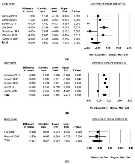 WC is an effective measure to assess central (visceral) adiposity and is strongly associated with all-cause mortality and cardiovascular mortality with or without adjustment for BMI []. This review reported that vegan dietary patterns significantly decreased WC in individuals with T2D. It is noteworthy that only two studies were included in the analyses and should be interpreted as exploratory due to limited scope. In a recent meta-analysis of 40 observational studies, the effects of vegan diets were compared to omnivorous diets on cardiometabolic risk factors and reported significantly lower WC of vegans []. No inclusion criteria for PBDs were provided, and the authors noted the definitions of vegan diets varied between studies.