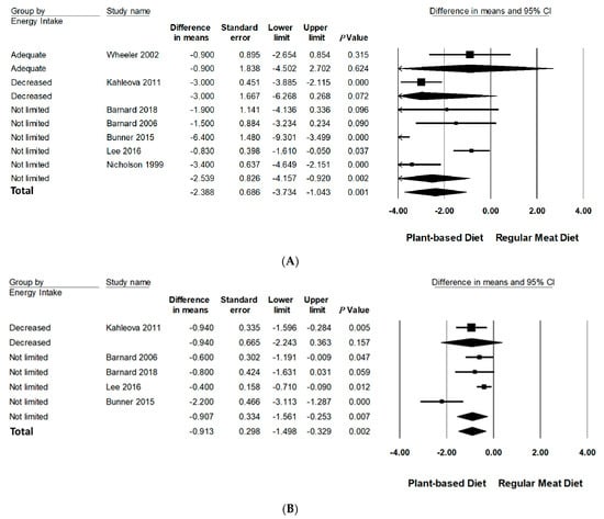 Forrest plots displaying differences in means (MD) and 95% CI for the impact of energy intake of PBDs compared to RMDs on (A) body weight (kg) [,,,,,,] and (B) BMI (kg/m2) [,,,,].