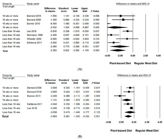 Forrest plots displaying difference in mean (MD) and 95% CI for the impact of trial length (weeks) of PBDs compared to RMDs on (A) body weight (kg) [,,,,,,] and (B) BMI (kg/m2) [,,,,].