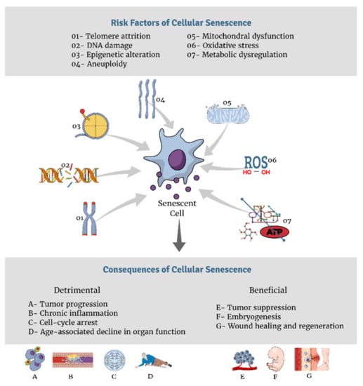 Risk factors and consequences of cellular senescence.
