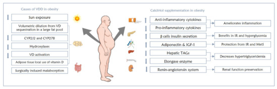 In spite of the positive proven role of calcitriol in obesity comorbidities, drastic effects should not be expected [1,63]. A meta-analysis proposing that the response of obese individuals to vitamin D supplementation is reduced showed that obese individuals preserve lower amounts of the supplemented vitamin D as compared to euphoric people, partly due to the large AT sequestration of administered vitamin D, and no additional benefits were found from higher doses of vitamin D supplements [63]. The link between VDD and obesity is summarized in Figure 2.