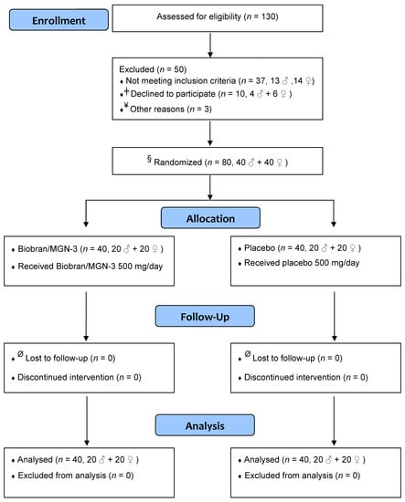 Figure 1. Simple flow diagram showing different stages of the clinical trial. ǂ Declined to participate when informed that the intervention included unlabeled coded sachets. ¥ Not enrolled to adjust males/females ratio to 1. § The principal investigator was not involved in the randomization or allocation procedure, which was performed by a statistician ignorant of the study. Ø Close monitoring, daily follow-up of subjects, and the relatively short period of the study (3 months) resulted in the absence of any dropouts.