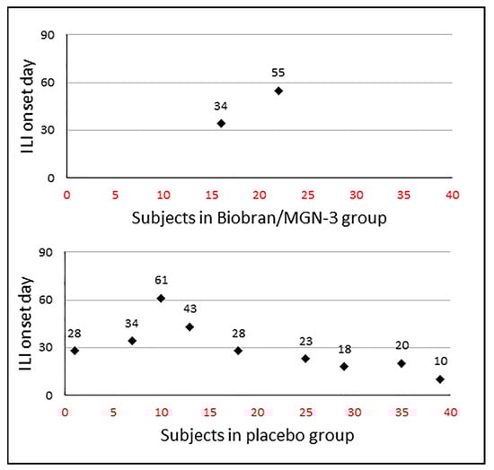 Figure 2. ILI incidence density distribution among the MGN-3/Biobran and placebo groups. The x-axis represents the patient number and y-axis represents the day of onset of ILI.