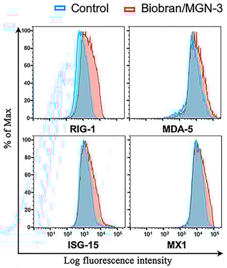 Figure 3. Upregulation of intracellular antiviral sensors RIG-1, MDA5, and their downstream responsive genes ISG15 and MX1 in the human lung BEAS-2B epithelial cells when exposed to Biobran/MGN-3 (100 μg/mL) for 72 h. Histograms depict gene expression as determined by the log fluorescent intensity on the x-axis, whereas % of cells normalized to the maximal number on the y-axis. At higher than average fluorescent intensity, higher % of cells exist due to shifting of the curve to the right. Each histogram is representative of three flow cytometry experiments.