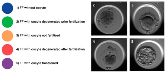 The samples were obtained following a standardized protocol (Figure 1). Controlled ovarian hyperstimulation was initiated by the administration of follicle-stimulating hormone (FSH) at days 2–4 of the menstrual cycle, and a GnRH antagonist was applied on days 5–6. Ovulation was induced by chorion gonadotropin (hCG) injection 35 h before transvaginal puncture of mature follicles (diameter >15 mm) under ultrasound control at day 12–16. Ten FF were collected per woman and preserved individually, as described [28]. Briefly, follicles larger than 10 mm in diameter were aspirated under transvaginal ultrasound guidance (GE Healthcare Austria GmbH, Pfaffing, Austria) with a Steiner-Tan needle 17 gauge and a Steiner flush/valve (IVFETFLEX.com HandelsgmbH & Co KG, Graz, Austria). Follicular fluid was examined for oocytes in an IVF workstation L24E with the heating stage (K-SYSTEMS Kivex Biotec A/S, Birkerød, Denmark) under constant conditions of 37 °C and subsequently individually stored at −80 °C. Fertilization was performed 1–4 h after oocyte retrieval. Embryos were cultured in time-lapse systems and transferred (or cryopreserved) on day 3 or 5 after fertilization. A pregnancy test was carried out 10 days after embryo transfer (ET).