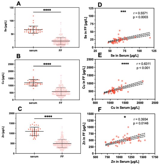 The concentration of Cu, Se, and Zn were determined in the serum and FF samples. The direct comparison indicates that all three TE are on average considerably lower in the FF than in the serum samples (Figure 3A–C). Evaluating the interrelation between TE concentrations in the matrices, i.e., serum and FF, strong positive correlations for Se and Cu and a less stringent correlation for Zn were detected (Figure 3D–F).
