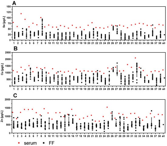 One serum sample and up to ten corresponding FF per woman were available for analysis. The direct comparison of the TE indicates a wide variety of concentrations in the different FF obtained from the same woman (Figure 4). The variation in TE concentrations of the FF within one woman can be higher than the variation between all the serum samples analyzed across the women. Notably, some FF are almost reaching serum concentrations (e.g., samples #8, #12, #26, #27, or #36 in case of Se), while other FF sample sets from a particular woman show a more uniform and relatively low trace element status (e.g., samples #2, #6, #11, #35, or #37 in case of Se) (Figure 4A). The same pronounced variation of concentrations and differences also applies to Cu and Zn (Figure 4B,C).