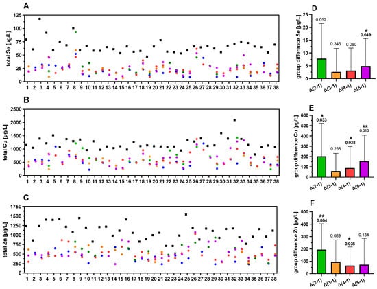 TE concentrations in FF in relation to quality characteristics. The FF are color-coded according to quality characteristics; group 1 (blue, poor quality), group 2 (green), group 3 (orange), group 4 (red), and group 5 (purple, highest quality), as described above (Figure 2). Strong differences between corresponding serum and FF samples and between the different FF of varying quality from the same woman are observed for (A) Se, (B) Cu, and (C) Zn. The mean differences in TE concentrations of the groups of FF with different quality (group differences) with respect to group 1 as reference (poor quality) are indicated for (D) Se, (E) Cu, and (F) Zn. In general, higher TE concentrations are observed in serum than in FF and among the FF with increasing quality. Samples 20–37 correspond to women with PCOS. Statistical significance is indicated by * p < 0.05, and ** p < 0.01.