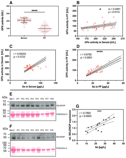 The nutritional supply with the trace element Se can be assessed by different selenoproteins as additional biomarkers of Se status [39,40], and a combination of these biomarkers may provide particularly meaningful prognostic information [41]. In this study, two complementary biomarkers were determined in addition to total Se in the serum and FF samples, i.e., extracellular glutathione peroxidase (GPX3) enzymatic activity and the concentration of the extracellular Se transporter selenoprotein P (SELENOP). In line with the findings of reduced total Se in FF compared to serum, also significantly lower GPX3-activity was observed in FF as compared to serum (Figure 6A). Notably, a linear positive correlation was observed for GPX3 activity in serum and in the corresponding FF samples from the same woman (Figure 6B). The GPX3 activity in serum of the different women was relatively constant and poorly related to serum Se (Figure 6C), whereas a strong and linear correlation was observed between GPX3 activity and Se concentrations in FF (Figure 6D). This finding raises the question of whether Se in FF is controlled and dominated by GPX3, with no or only minor contribution from the Se transporter SELENOP. However, Western blot analysis detected immunoreactive SELENOP at the expected size of 50–55 kDa in FF, and the quantitative analysis showed a strong positive linear correlation between SELENOP concentration in FF and total FF Se concentrations (Figure 6E–G).