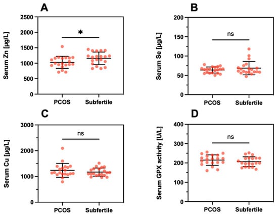 Serum trace element concentrations and GPX3 activity in relation to PCOS. The direct comparison of serum (A) Zn, (B) Se, (C) Cu, and (D) GPX3 activity indicates minor differences only, with the notable exception of a slightly suppressed serum Zn concentration in PCOS. Tested with a linear mixed model; * indicates p < 0.05. ns indicates no significant difference.